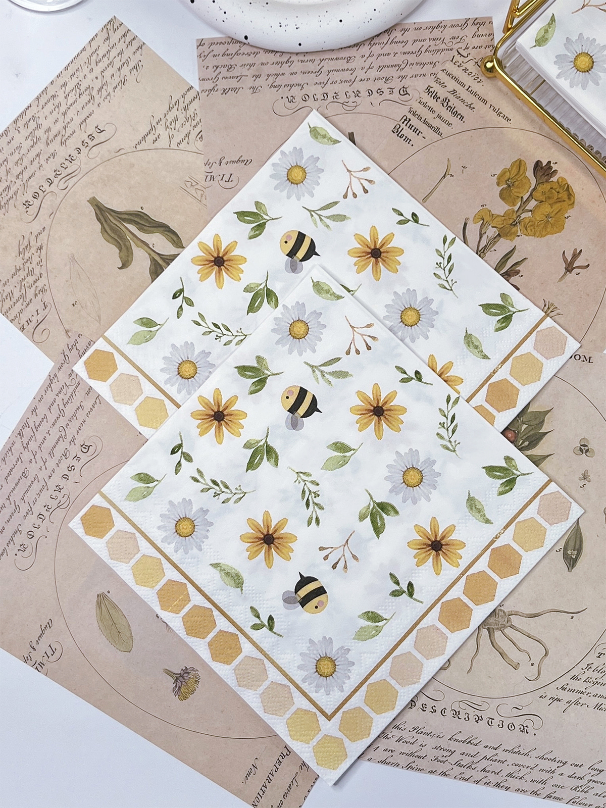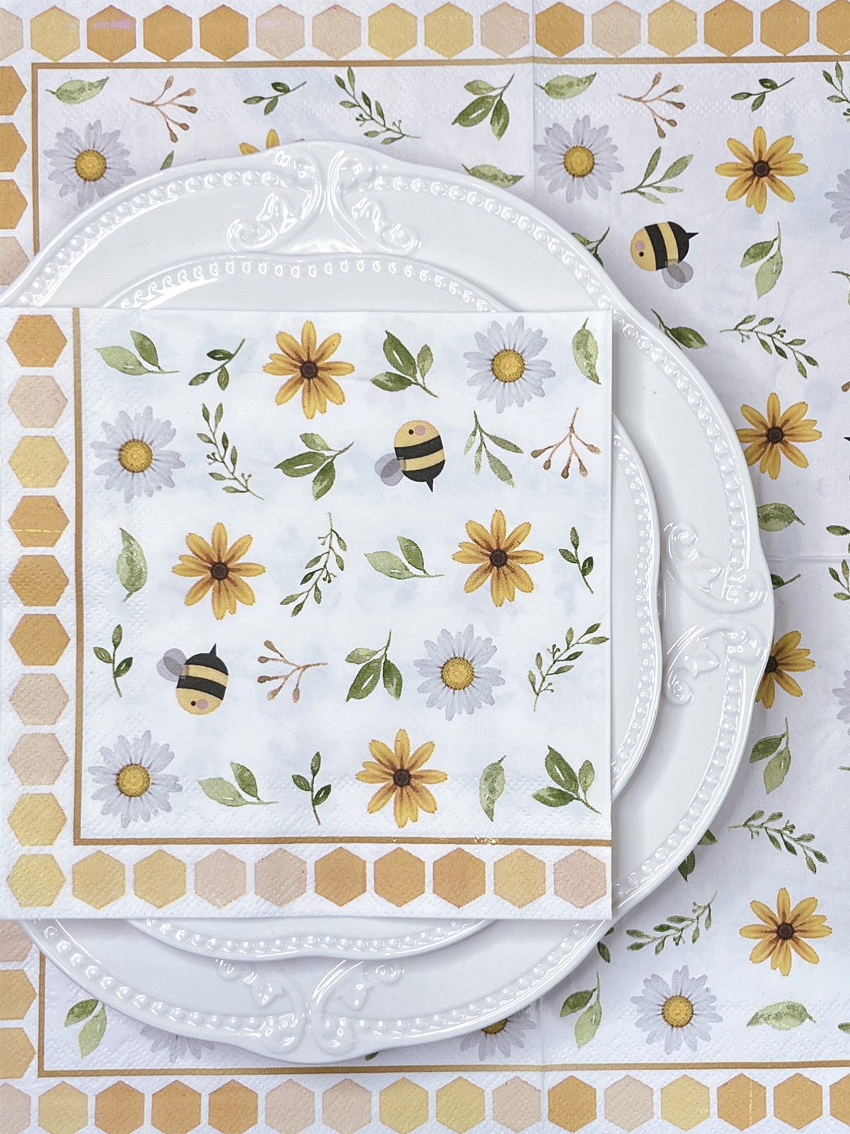 Estas servilletas de 3 capas con estampado de abejas y flores para almuerzo, servilletas de papel decorativas para cenas y fiestas miden 13 x 13 pulgadas cuando están desplegadas y 6,5 x 6,5 pulgadas cuando están plegadas.