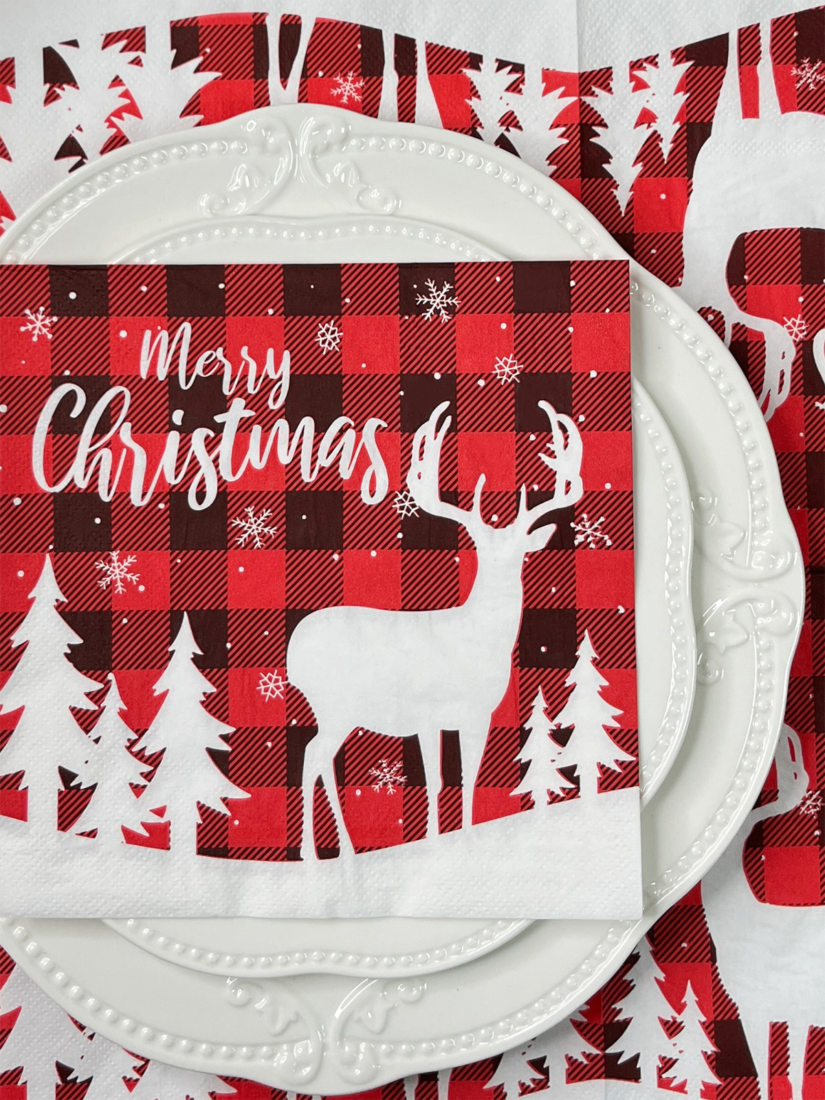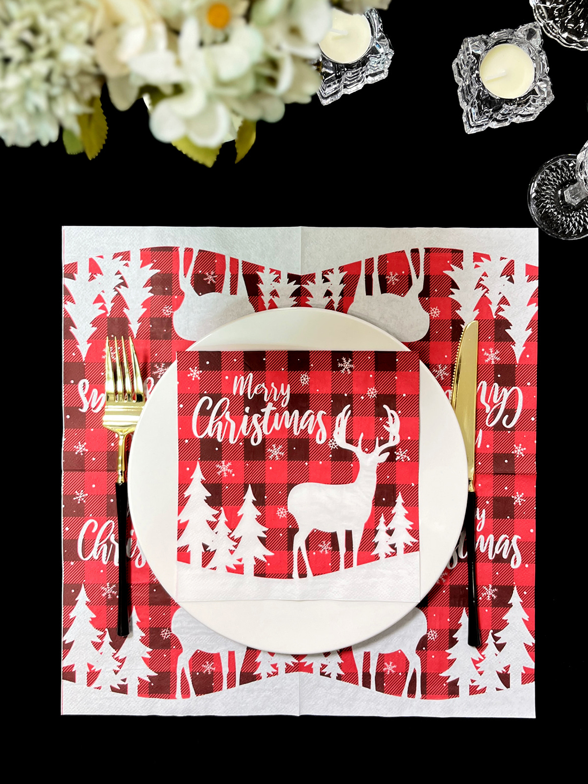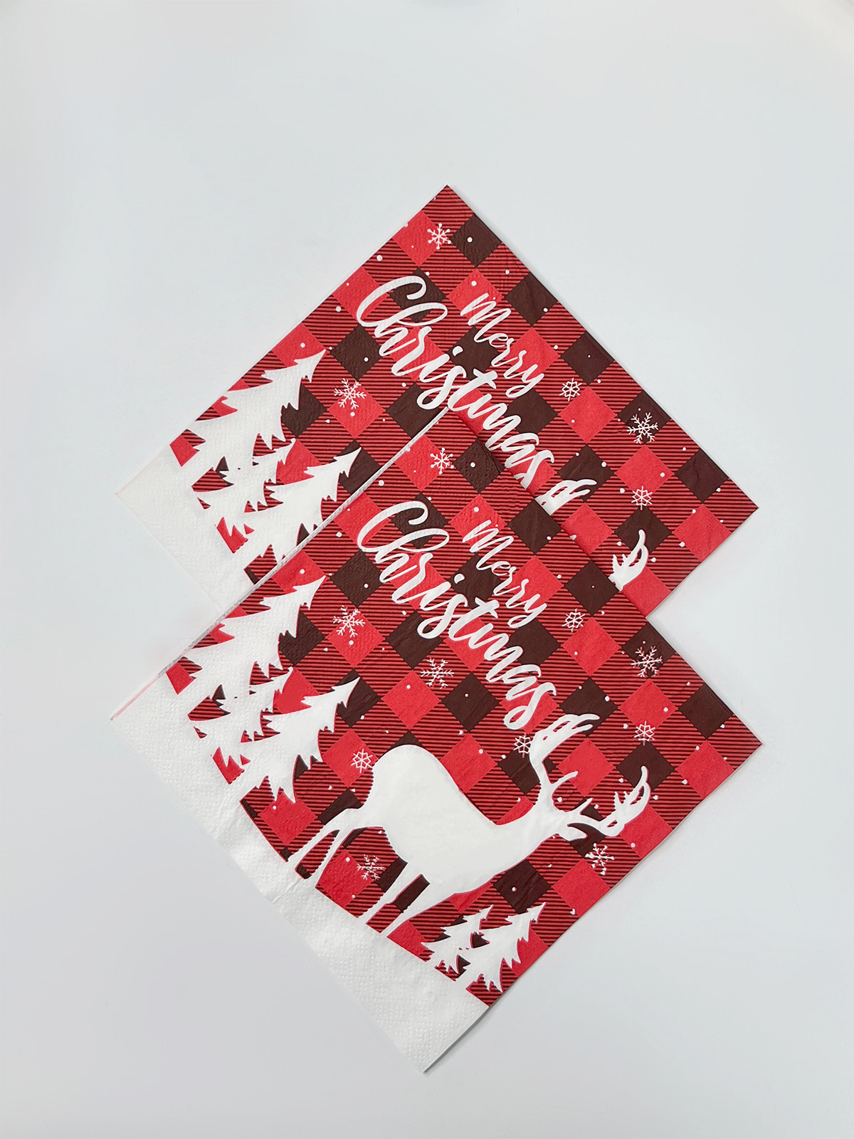 Estas servilletas de papel decorativas navideñas rojas, servilletas de papel para decoupage están diseñadas con algunos elementos navideños clásicos, como árboles de Navidad, renos y copos de nieve sobre un fondo a cuadros rojo y negro. Este diseño le brinda a usted y a su familia una sensación cálida y agradable y crea un fuerte sabor navideño.