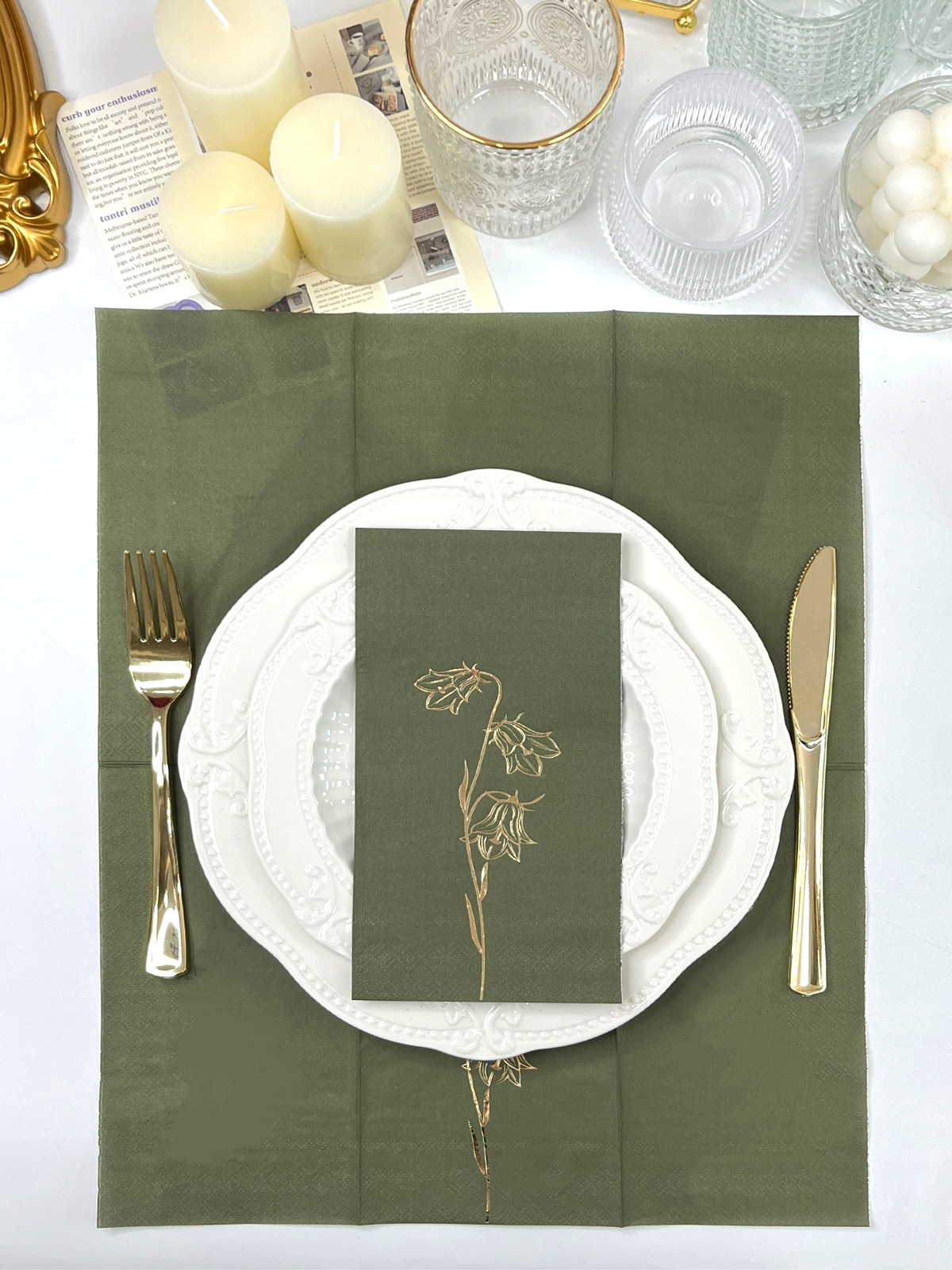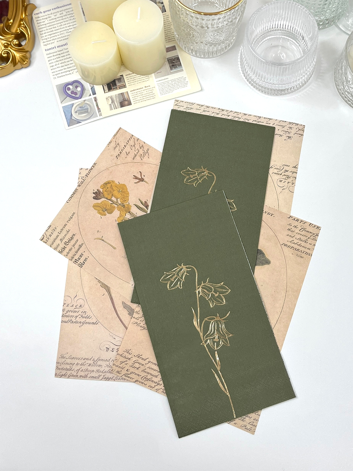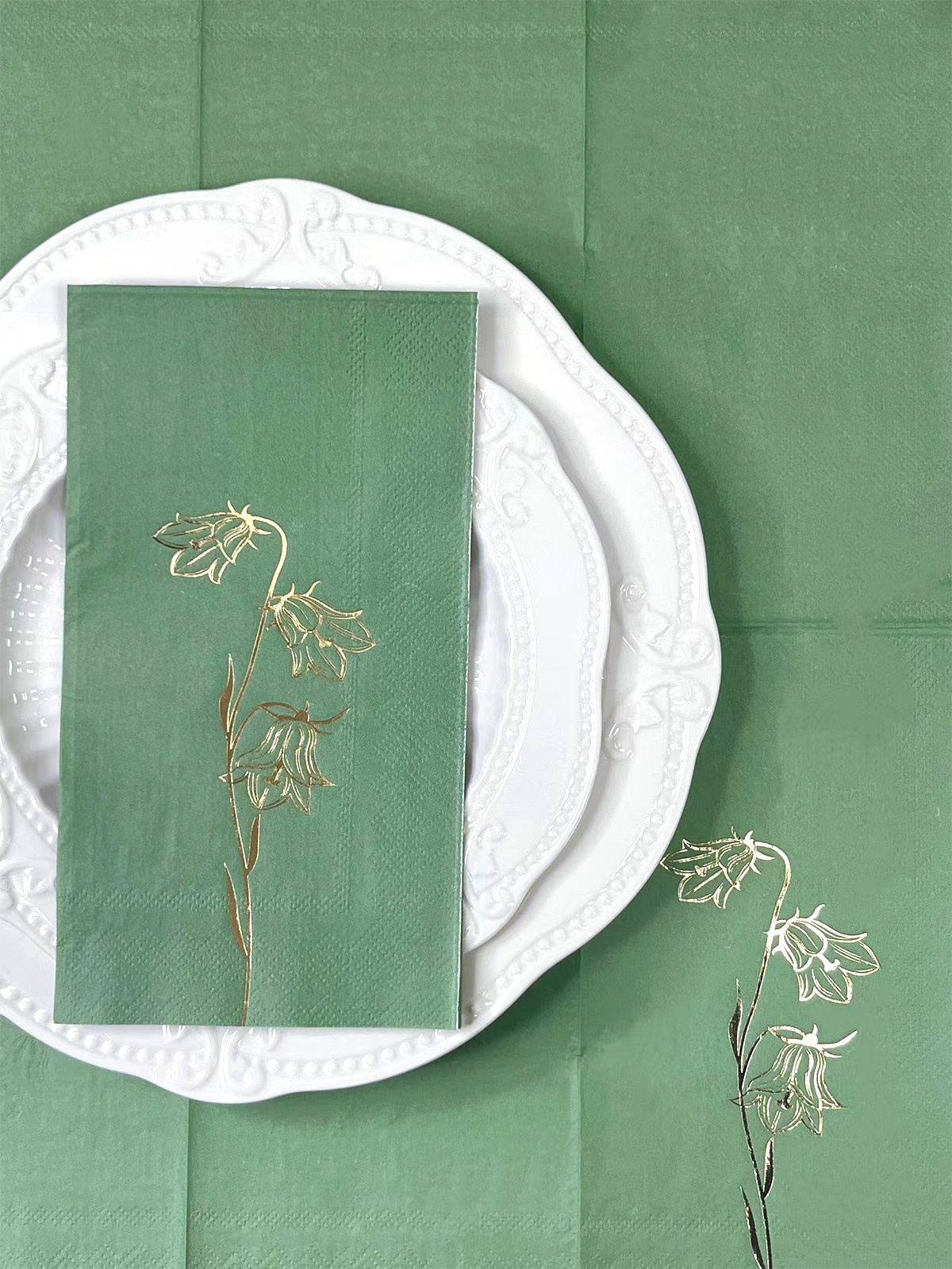 Las servilletas para invitados de lirio de los valles de lámina dorada presentan intrincados diseños florales sobre fondos verdes y verde oscuro. Son decoraciones de fiesta atractivas y elegantes, adecuadas para bodas, cenas, baños y más.