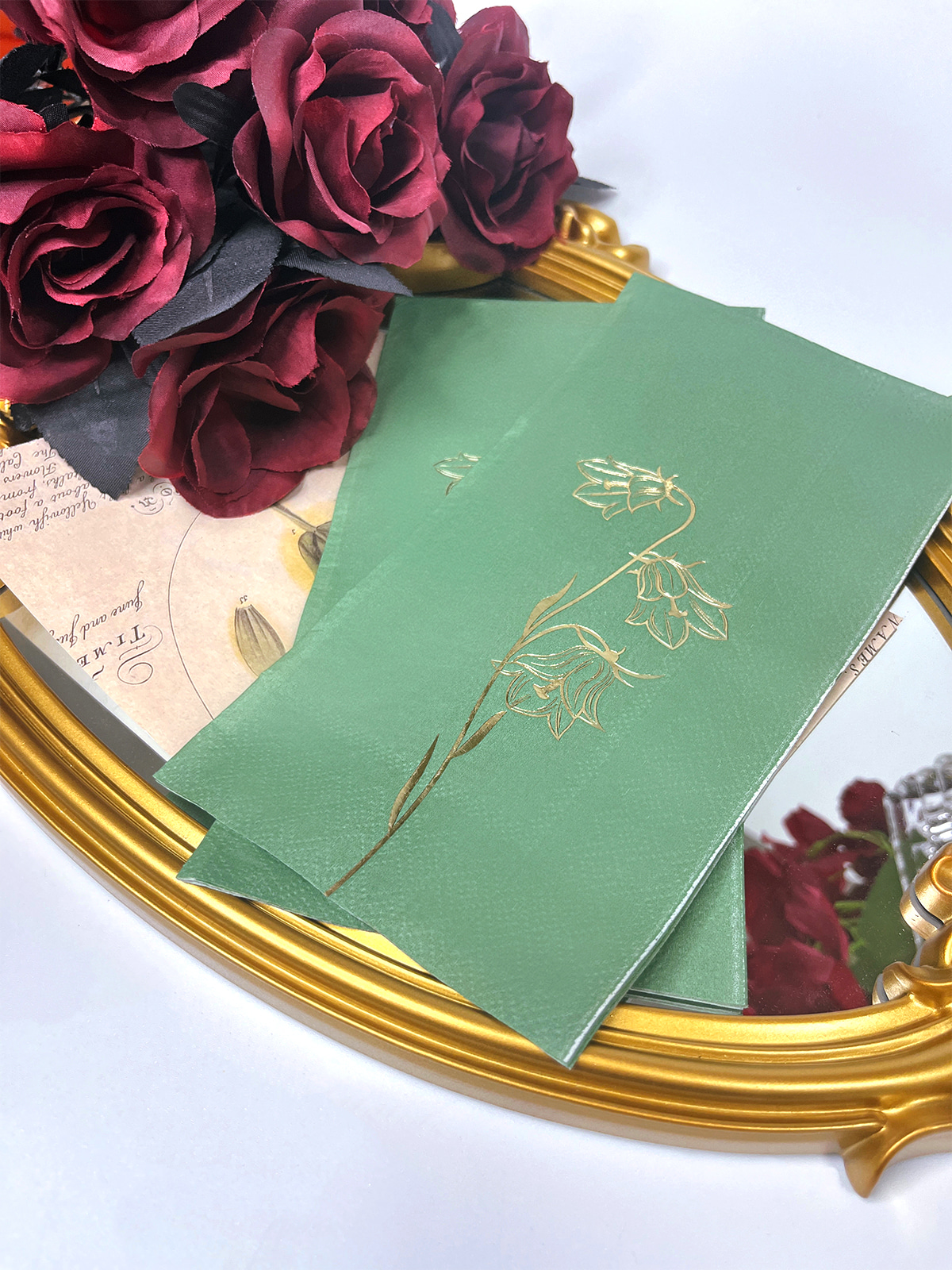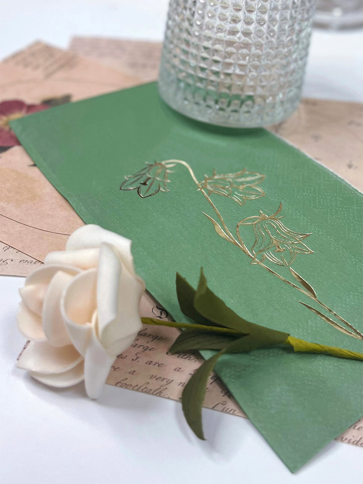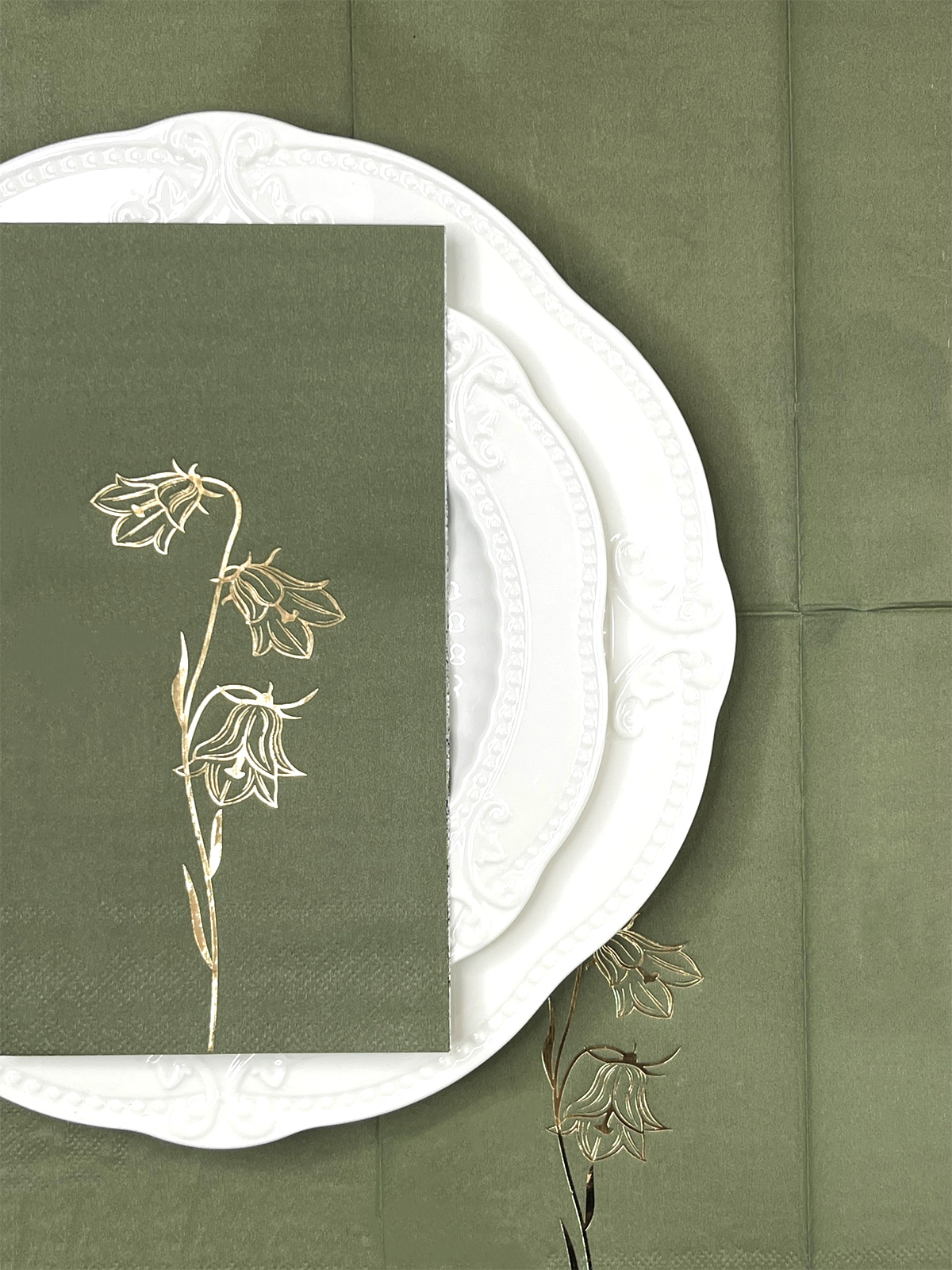 Las servilletas para invitados de lirio de los valles de lámina dorada presentan intrincados diseños florales sobre fondos verdes y verde oscuro. Son decoraciones de fiesta atractivas y elegantes, adecuadas para bodas, cenas, baños y más.