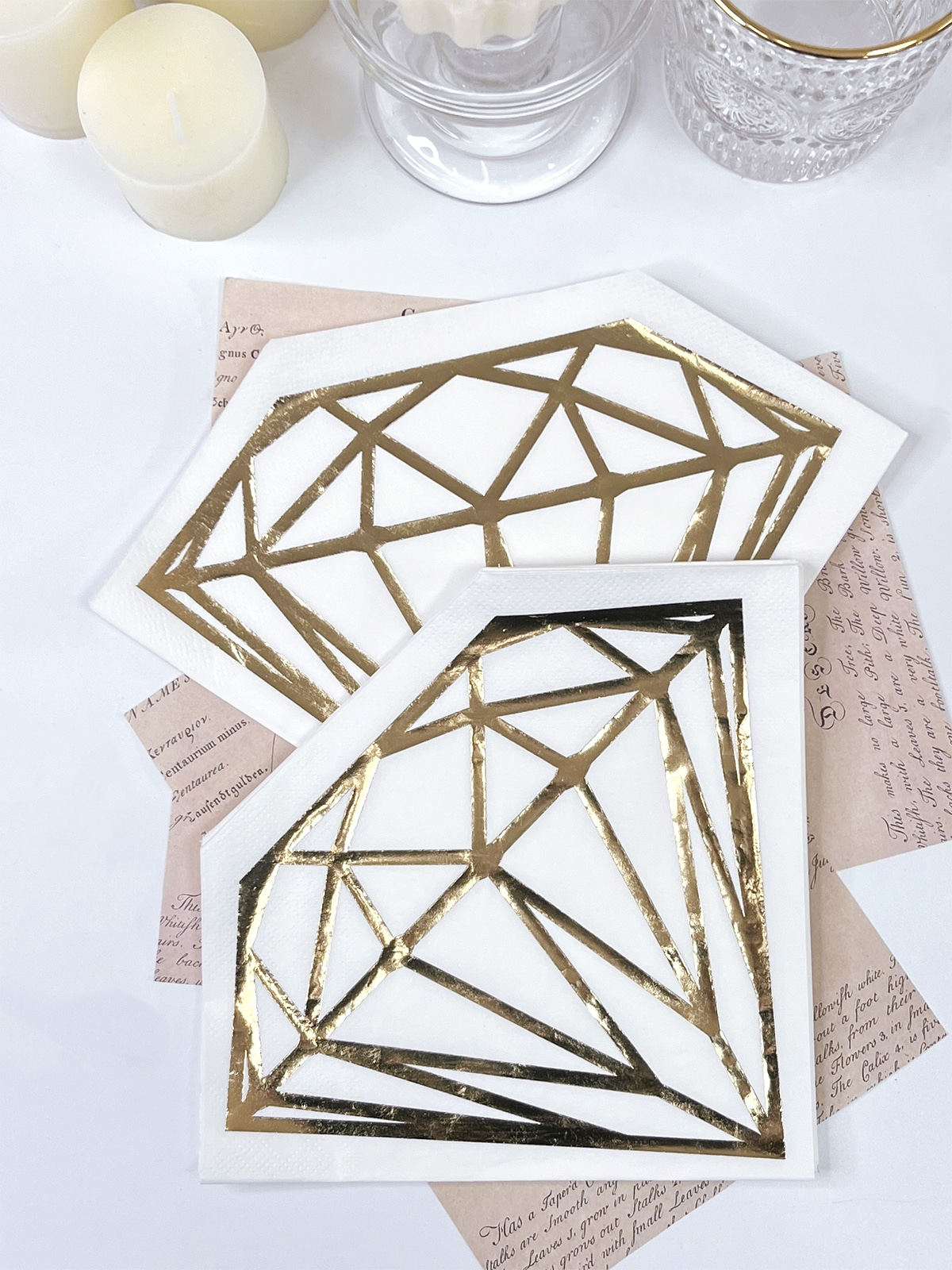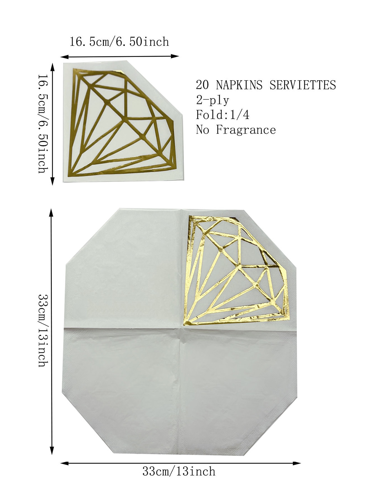 Las preciosas servilletas de papel con forma de diamante cuentan con una elegante impresión en lámina dorada y decoraciones con diseños troquelados, añadiendo un toque de novedad y sofisticación a sus ocasiones especiales. Impresione a sus invitados en despedidas de soltera, decoración de propuestas, bodas y fiestas de compromiso con estas impresionantes servilletas.