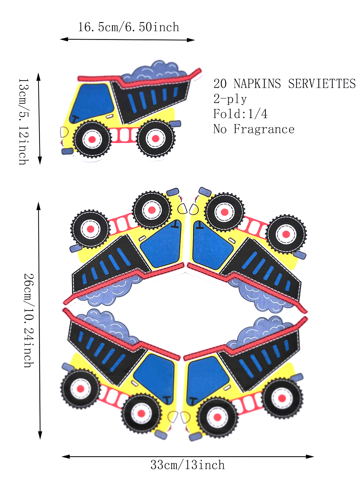 Estas servilletas de papel con forma de camión miden 1 x 3 10,24 pulgadas cuando están desplegadas y 6,5 x 5,12 pulgadas cuando están plegadas.