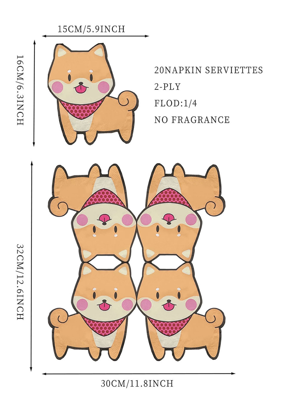 Esta servilleta de papel con forma de perro mide 11,8 x 12,6 pulgadas cuando está desplegada y 5,9 x 6,3 pulgadas cuando está plegada.